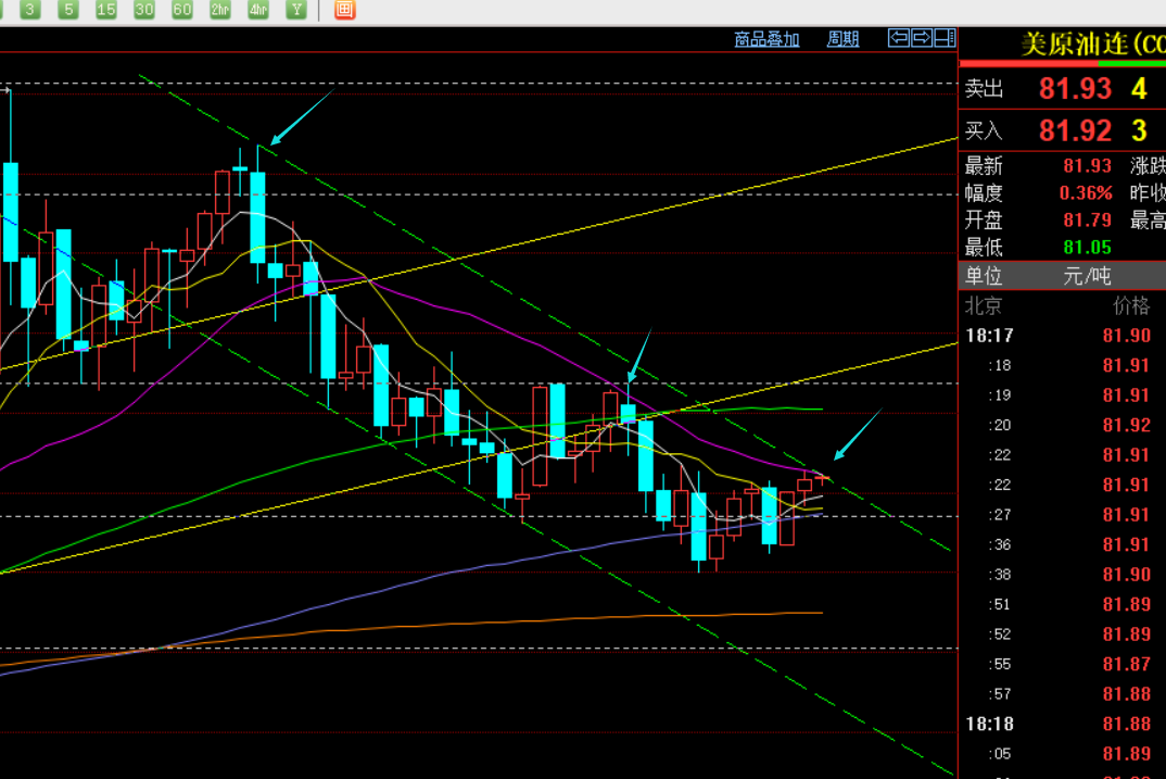 原油方面:周线方面这几周产生了规律性:大阴之后不延续跌,而是连阳反抽回归至大阴开跌口,然后再砸盘出大阴;图中通道上轨周初测试很关键,刚好也是中轨承压,82.3-82.65阻力区能否压制对于短期后期的节点变化很重要; 另外日线通道角度看,也有一个关键反压点,就是上移83.6,靠近84下,周初测试这两个压力点出现承压信号可介入试探; 短线小时线周期自82.6砸盘至78.5后,又开始震荡上行背离逼空了,价格震荡走高,macd逐步走低,拉高要谨防一波回测;81.1早盘提示支撑暂时有效,若有效破位失守,则会再次打压;