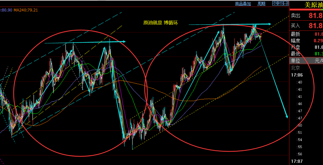 原油方面:从图中可以明显看出,和前者的走势很似雷同,先一路震荡逼空,到前期高点形成双顶承压,然后一路走弱下跌,这也是昨日指出82.65下去看压制回测的原因,也刚好是周线中轨和下行通道上轨承压共振处,所以82.65能否短期双顶压制住是很关键的,支撑81和79.9,要逐步跌破,那么短期顶部就会慢慢出啦,那样就是继续日线级别的宽幅来回整理;