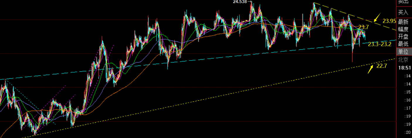 白银方面:当前波动不大,阻力还是隔夜高点23.7一线,通道上轨阻力下移23.95一线,回踩支撑关注23.3-23.2,以及通道下轨支撑22.7一线,仍建议反弹看跌为主;