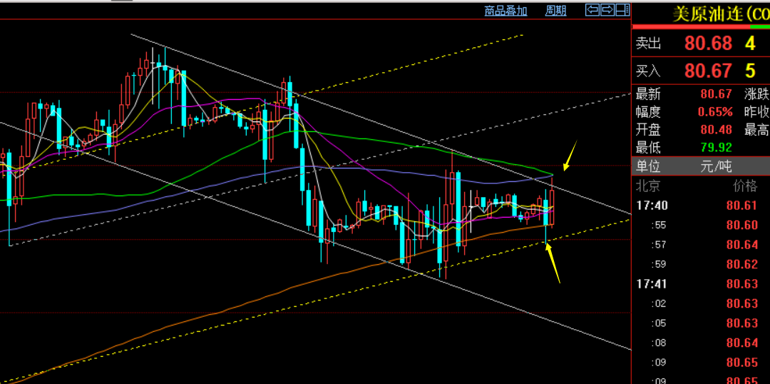 原油方面:昨日算是底部窄幅反复横盘了一日,到现在仍处于震荡中,80.7一线阻力关注得失,昨日81.2作为一定防守判断对错,关注图中上轨80.8一线,下轨80一线,往上走就可能暂缓震荡下跌扩大区间去震荡;往下走,则打开进一步下跌空间去试探日线关键中轨位置;