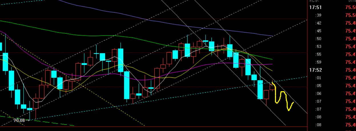 原油方面:昨日指出上周五大阴破位通道后,反弹继续看震荡走跌,稳健阻力点是75上,但反弹力度不大,反而预期支撑72.4测试到位;今日白盘延续隔夜探底V拉升一波,最高冲击76一线,从通道可以发现,也是触及了上轨阻力点,同时78-72.2反抽618分割阻力是75.7,因此判断75.7及上方是存在一定承压作用的;今晚留意小时线10均线,只有破位失守它有效,则可以结束隔夜起来的这波逼空拉升,转下调进行区间内震荡,支撑74.5、73.6、73都有;