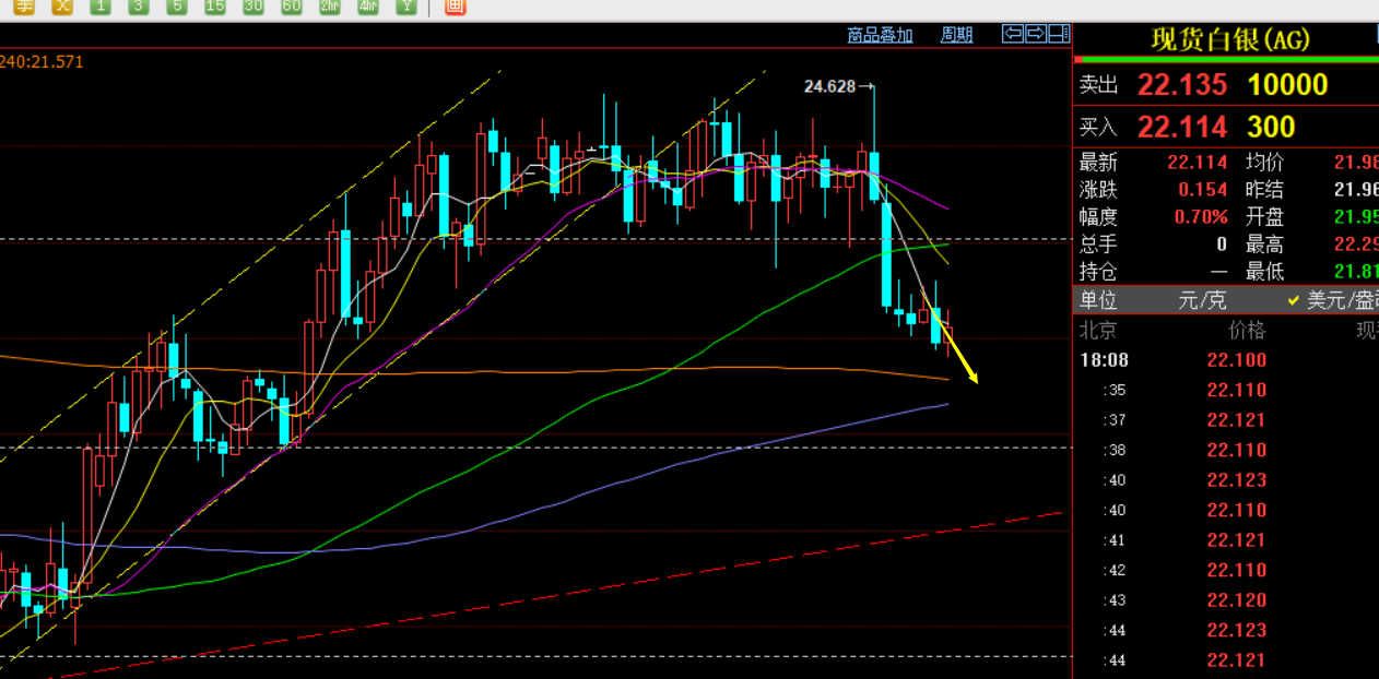 第二,白银方面:同样的,强调一点,只要不突破22.65关键阻力节点,仍处于底部弱势震荡运行,修正周期一到,延续一波续跌,击穿22支撑,最低下探21.8,看跌成功;