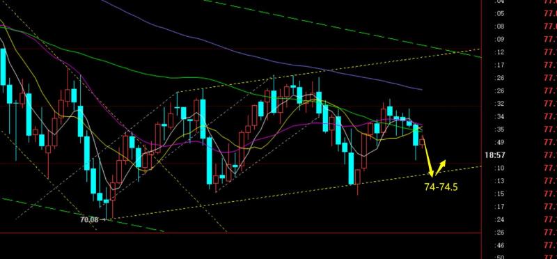 原油方面:日线近期仍处于宽幅来回大震荡中,底部多空一直在争夺,选择后市的方向;从黄色通道来看,下轨支撑74.5-74是本周初要留意的支撑节点,今日阻力两个,一个是顶底位置77.4,一个是5均线和66日重合点77.7-77.9一线,处于短期均线下运行,走势震荡偏空,反弹先看跌为主;当前小时线处于一定震荡逼空中,等10均线有效破位失守后,方可测试看跌;