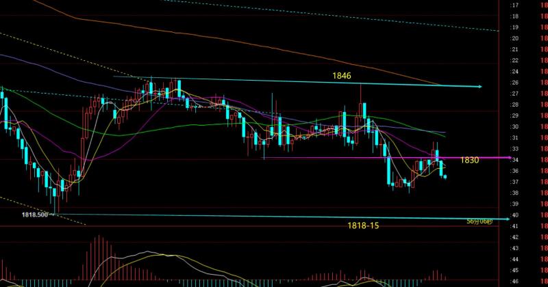 第三,黄金小时线级别:隔夜一路下跌走弱,收盘无力承压1826一线,而作为震荡期,第二天见早盘先续跌而出现探底拉升迹象,则可以先看一波反弹,成功一波拉升后,则依托382分割阻力1832一线,极限618分割阻力1836-37一线反手看跌;当前已经开始压制,中轨1830成为阻力点,关注欧盘期间能否破掉隔夜1823低点,一旦实现,美盘仍是可二次弱势看跌它,支撑重点留意1818-15区域如何,处于分割节点;风水岭1834一线也就出现了,若上破,则会回归1846-1818之间的反复行情;而下破1818-15,则直接弱势会延续至1800概率;总之,维持反弹看跌为主思路不变;