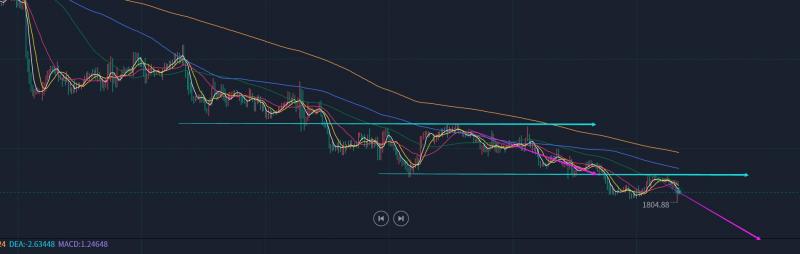第三,黄金小时线级别:隔夜探底拉升一波,作为震荡行情,最希望看到的是早盘先小幅反弹续涨,那样容易不延续而回落一波,时间节点一般关注10点前后,因此1819高点如期承压下行;当失守10均线有效后,反抽确认此线又是一次看跌机会,美盘前基本可以把握这两次时机;当下应该要窄幅整理下,风水岭阻力下移1817一线,支撑1805-06,短期阻力关注5日,极限10日,要震荡延续下滑,是不会再突破站上10均线的,那样一旦发生就会导致反复的上下串;所以,1812、1814是短期阻力点,继续维持承压看跌为主,再去破新低的话,就应该可以试探1800关口了;而刷新低后,可能又会出现反复的背离反弹,相对好的博反弹位置还是会耐心等1788或 1788-1775区域,预计也是一定拐点会出现;