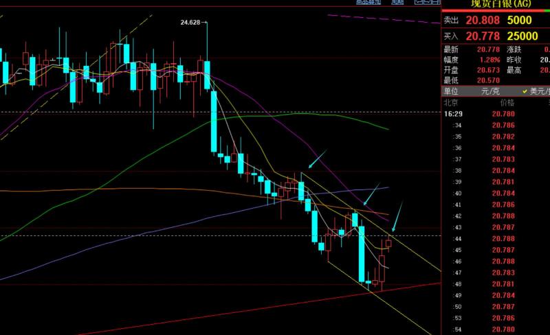 第二,白银方面:它的拉升力度倒依旧不大,仍只是刺破10均线,整体还保持完美的下跌通道中运行;当上周五20.4被突破站上时,就意味着不是弱势压制了;