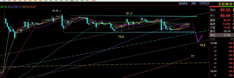 原油方面:昨日依托81.2下不断看跌压制,符合预期思路;目前通道线回踩支撑第一道已经失守,81.2成为重要的风水岭,此处未突破站上前继续先看压制下行,第二道趋势支撑点大概关注78.6,再往下就是日线10均线77.8,以及小时线年均线77,一步步来,这几日油价走的相对墨迹;想要油价跳水,必须得破位79.6关键支撑才行,这里反复撑了好几次,耐心等待;