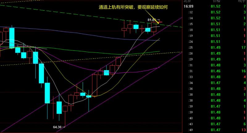 原油方面:昨日晚间探底V拉升,持续上涨突破了日线关键的通道上轨承压点81.25一线,虽收盘价离通道线不远,但毕竟是冲破了,今日要谨慎对待,留意破位之后的延续力度如何来定;若今日继续收阳,那么上破就稳定,后续油价会进一步的上攻;反之,收阴回归于通道内,则昨日拉升破位是作为一种幌子,届时看压制回测;当前就先多观望,支撑留意81.1一线,阻力81.8,看这个小区间的上下破位得失;