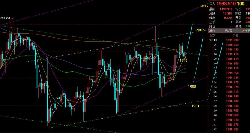 第三,黄金小时线级别:昨晚冲高大幅回落,凌晨后支撑1983反弹至1991一线,今日早间依托1988上直接延续反弹拉升,又冲击到了2000上方,对于宽幅的频繁洗盘,针对618分割法则是不适应了,要扩展至786,甚至886分割才有相对好的支撑或阻力作用;当前横盘于1997上,阻力2003,小范围又开始争夺了,10均线支撑刚好也是1997,作为近期高频率洗盘,此位置也不太适合,因为有所卡中间点,2009-1983的中间位置;那么好的位置一个是 以隔夜低点1983到目前高点2003回测的786分割点1988一线,刚好共振于1976-1983趋势支撑衍生点; 另一个极限好的位置就是这几日各低点连接的趋势衍生点1980-81一线;因此,对于反复整理来讲,今日1988、1980逢低都是相对好的看涨点,阻力2003-2009区域,往上是2015和2020; 拉高仍还是出现快速掉头向下,再去看跌压制;