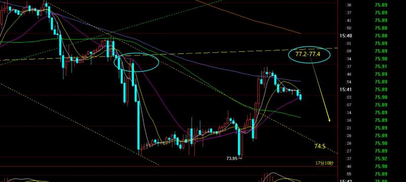 第三,原油方面:早间给出75.6挂空,结果只给到75.5就跌至74目标,美盘初仍压制75.6通道阻力下运行,但凌晨前后进行了上破,涨至77.9下高位;看跌压制则失败;