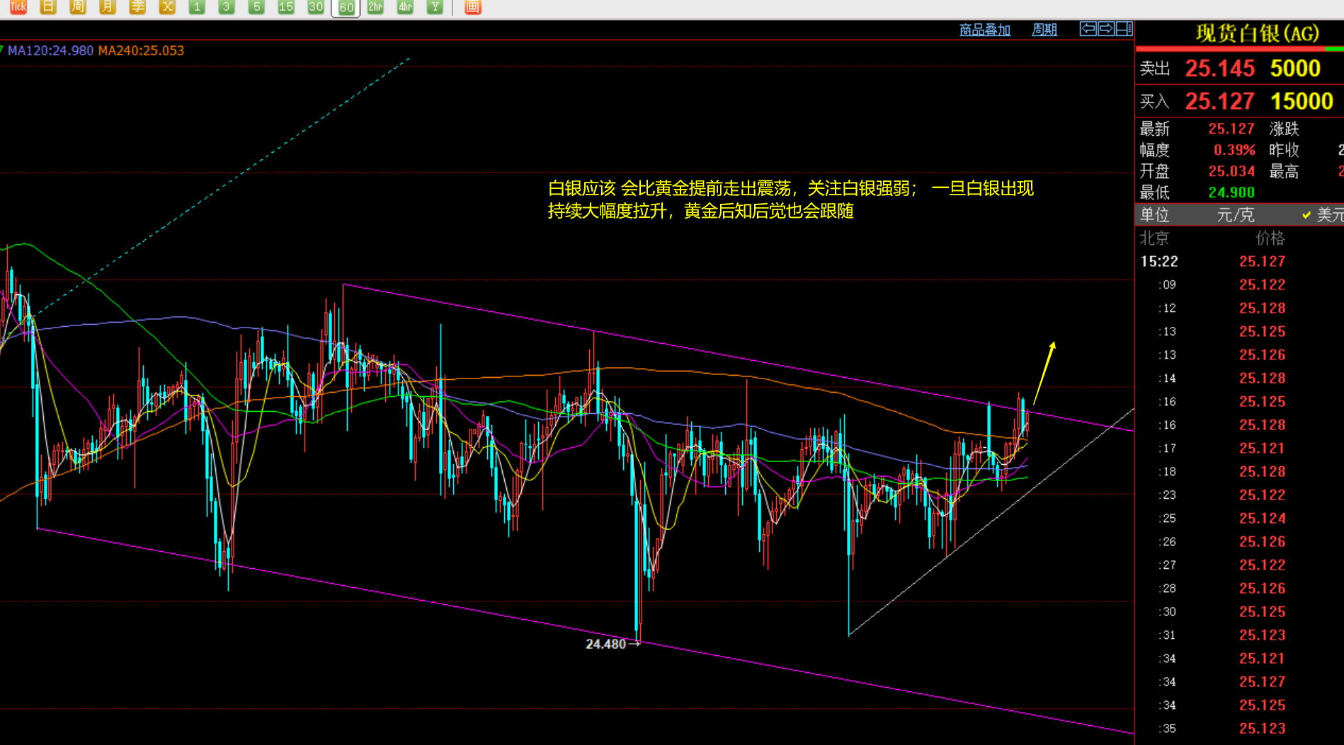 第二,白银方面:文章中指出24.7上支撑继续看涨也成功拉升,最高触及25.1一线;