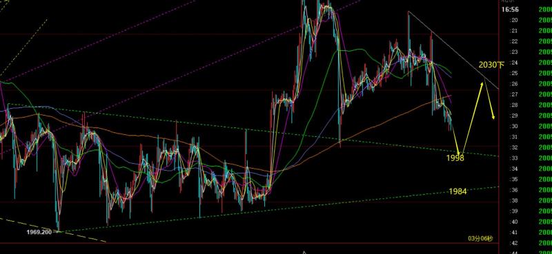 第四,黄金小时线级别:隔夜凌晨后压制2022一线,今日早间承压2017下直接走了续跌,目前最低触及2005一线,当前可以说处于压制10均线下的震荡慢跌格局,同时对应macd又出现了底背离状态,也就是说到某一刻会因为背离的积累而产生一波超跌反弹的拉升修正行情,而这个时间点一般关注美盘前后;按照通道指引,下方有一处1998一线属于前期收敛三角通道再次回踩的上轨支撑点,5月6日当时确认过一次,今日有可能第二次去试探;再往下就是下轨支撑点1884上,越拉越容易蓄力,弹簧原理;短期阻力关注10日和中轨承压,风水岭2017-18;总之,当前处于2017-18压制下慢跌进行,支撑留意1998及下,也就是2000下方价格越低支撑越强,预计美盘前后会出现一波超跌反弹的修正拉升,可以冲破风水岭2017-18,然后承压2025-2030阻力再进行回测压制整理;