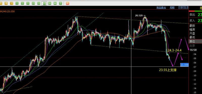 第二,白银方面:近期一段时间白银都坚持以回测看涨为主,从22美元开始一路看涨至26关口,4月份于24.4-24.5回踩通道支撑作为节点,仍是高位逢低做多为主,都基本成功拿下,过程中难免出现的几次小回调都不足以改变偏强多头的整理;但昨日的确比较意外,白银大幅度跳水,且失守24.4-24.3支撑,布局回测看涨思路显然是失败的;