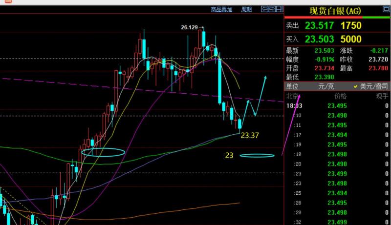 白银方面:黄金这几日大幅的下挫,但白银显然有所抗跌了,这可能是因为上周白银大阴已经提前释放了,所以白银若能提前企稳拉升,黄金离企稳也就不远了;当下关注日线66日和半年线共振支撑23.37一线,也是今日当下的低点,可尝试看企稳反弹,极限关注23一线,属于50%分割位置,也是前期顶底支撑;短期阻力5均线23.8,突破站上看 24.2-24.3通道反压,图中的紫色线,重回24.3上方,则回归偏强局面;
