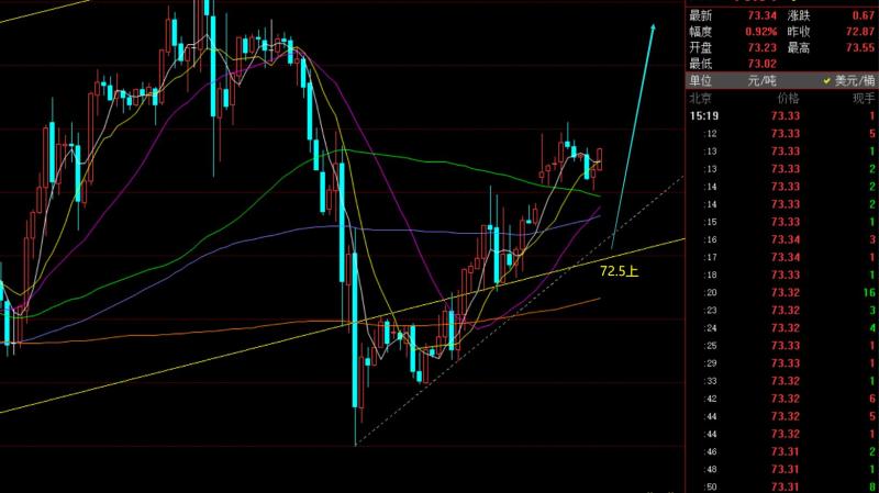 第三,原油方面:同样上周五亚欧盘持续震荡反弹,美盘依托72.2上看二次上涨正确,今日最终抵达73.3;