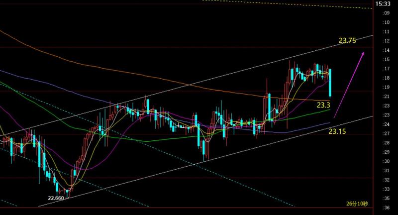 白银方面:日线级别它的收阳形态比黄金强些,今日短期均线也趋势金叉,支撑于23.3一线,意味着今日23.3及下是存在一定买盘的; 从图中通道来看,23.15一线是下轨,日内就关注这两个位置的企稳情况,守住则可以延续通道内运行,上轨阻力23.75一线;