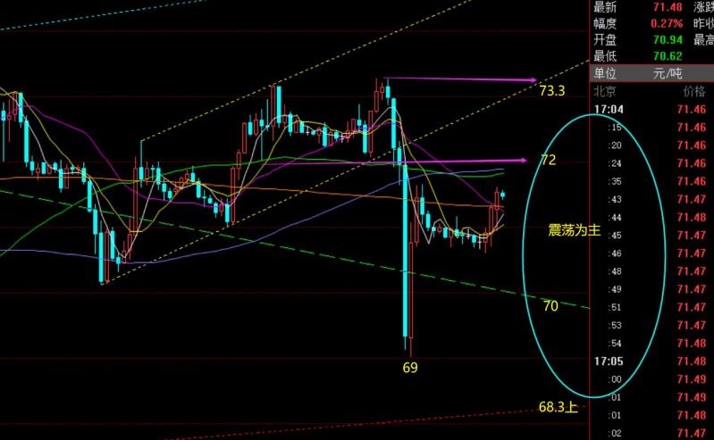 第三,原油方面:欧盘守住72节点支撑,迎来一波拉升刺破隔夜高点73.18,由于欧盘并未走强拉升,美盘就存在一定回测,只是借助了半夜利空消息,失守72后直接跳水至69一线,刺破70.4盘中第二支撑再拉升;研报指出油价近期都看宽幅整理,计划74下反手看跌,但价格并未触及;