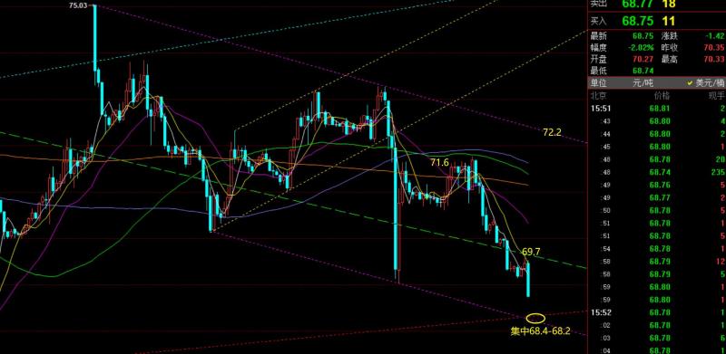 第三,原油方面:亚欧盘多次承压凌晨阻力71.6,美盘安排了71.4跟空,进场后最低只给到70.8,然后上下反复了几个小时,也是接近凌晨了,还无法下探,就准备休息了,提示回落本钱调仓,最终收盘前偷偷下去了,抵达了原本目标;