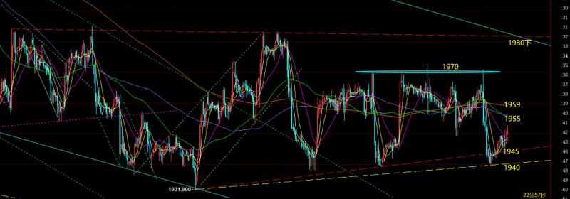 第三,黄金小时线级别:隔夜一波持续走弱下跌,今日亚盘并未延续走弱,而是展开一路反弹,欧盘也有所破高,这仍是震荡的节奏;此时中轨已经站上,1947就成为一定支撑,欧盘起涨点是1945也要买盘,此位置上先上涨来对待,阻力66日均线1955,往上年均线1959,也是618分割阻力,它是今日短线的关键承压处;若能重新站上年均线,就有v回去的概率;而凌晨2点利率公布之前,价格若能处于相对高位1970上下的话,即便是利空,也暂时还能反复撑住1940,后期会继续看好拐点变盘向上发展; 若是利多,就可以冲1980及上方,甚至走出近期震荡冲1990、2000;反之,利率公布之前,价格维持于1960及下相对低位或中间的位置,利多就不用多了,所希望的,而利空,再度测试1940就有所危险;走一步看一步,当前就以1945作为节点支撑,先看涨反弹,阻力1955、1959、1970等;