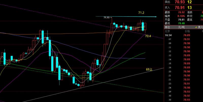 第三,原油方面:昨日一路逼空上涨,幅度同样较大,最高触及71一线,当欧盘前后一根大阳拉升,突破站上小时线10均线后,就提示逢低看涨,继续来回震荡;