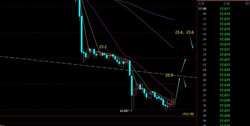 第二,白银方面: 昨日同样比较弱,23.4阻力都不给机会,也指出可能会下破22.9支撑,最低触及22.48;
