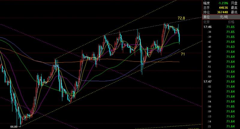 第三,原油方面: 昨日指出72.5一线中途的趋势阻力看承压,支撑71,区间内运行符合;