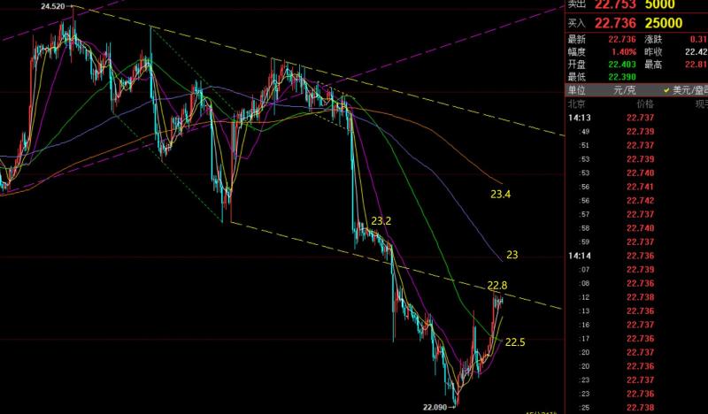 第二,白银方面:上周五提出日线年均线22一线存在买盘支撑,早间也是续跌试探22.1后,开始出现小时线底部大阳企稳形态,因此午后择机看反弹,当欧盘站上小时线中轨后,稳定上涨修正背离指标,最高触及22.67一线,尾盘回踩再次确认中轨企稳,今日拉升至22.8一线,抵达预期最终目标点;