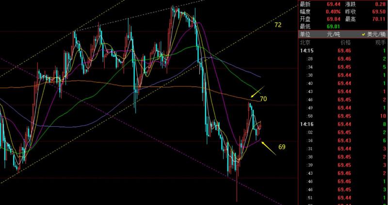 原油方面:日线近期维持于67-75宽幅区间整理,上周五探底拉升收报较长下影企稳K,就意味着仍处于此区间内运行,那么守住67一线,后续就大概率会再次反弹一波; 从小时线级别看,中轨69处是日内关键节点,70一线也是,守住中轨则看好70的上破展开延续反弹,那样日线形态上就是先不回补影线,直接上冲震荡 ;反之,破位69下行,则日线形态上就是先回补影线,再企稳上冲震荡,本周短期阻力72及上方应该会迟早试探;