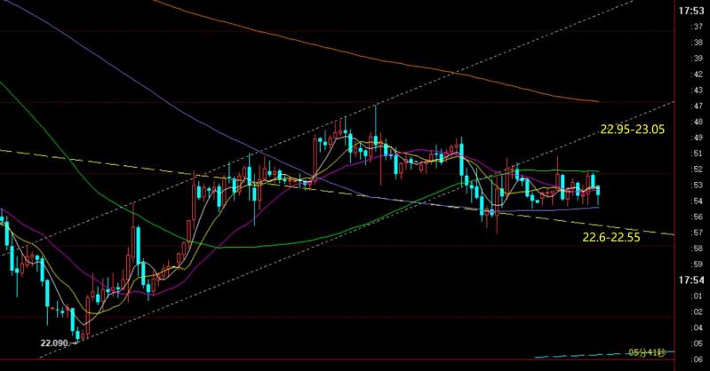 白银方面:目前白银也在小区间横盘做上下选择;支撑当下是22.6-22.55,阻力22.95-23.05; 若往上突破站上,则冲击23.2、23.4,强压23.6一线再冲高回落; 若向下破位,则指向22.28、22企稳反弹;同样,也由于底背离的存在,倾向于横盘直接上冲反弹再压制,或者诱空一波再探底拉升上冲阻力位;