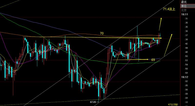 第三,原油方面:昨日依托小时线中轨再次延续反弹,当大阳出现后,回踩69.6跟多,美盘抵达70.6拿下;夜间再次冲高回落反复给到69.6再次多,当前又开始拉升;