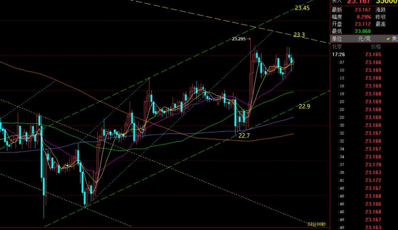 第二,白银方面: 周二和周三一直提出以22.8-22.9作为支撑节点看震荡拉升,守住22.7顶底位置即可,最终美盘一波急拉,刚好到位23.3目标;