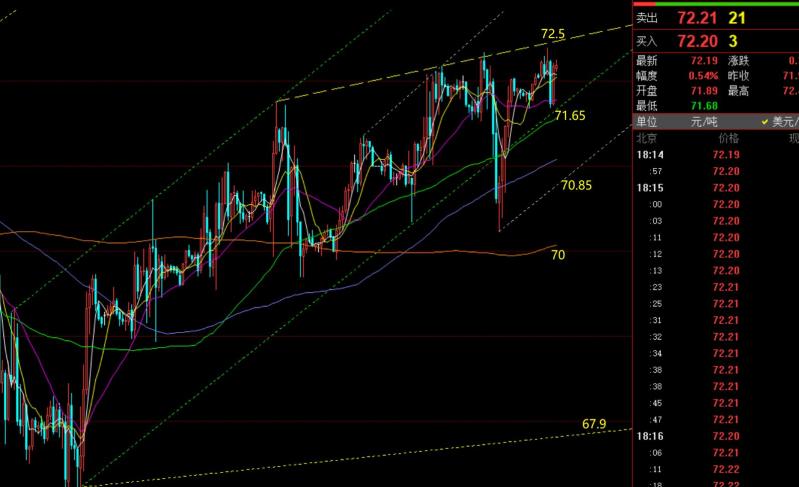 原油方面:也直接看小时线通道来指引,当前关注上轨72.5一线,前高是72.7一线,下轨支撑两个71.65和70.85, 而70关口是作为震荡强弱的变盘点,守住整体就维持震荡偏强反弹;守不住就震荡偏弱,会逐步指向67.9;参考6月中旬前后,要谨防油价掉头;关注72.5-71.65区间的有效得失情况;