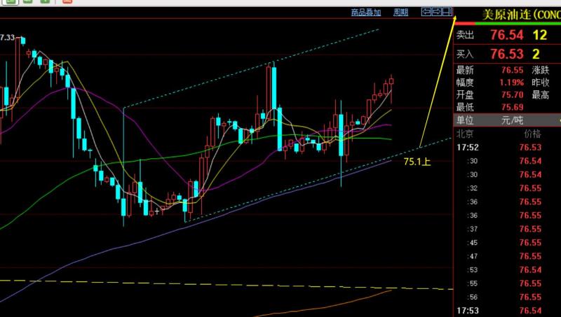 第三,原油方面: 昨日亚欧盘先震荡一路上涨,抵达76.15预期目标阻力后,美盘跳水一波至74.5低点,随后半夜又企稳洗回去,短期还处于偏强震荡拉升中;