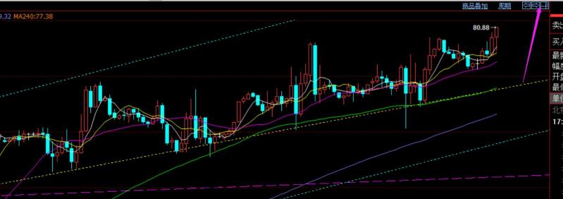 原油方面:周线和日线都是连阳,单边拉升格局继续保持不变,不轻易言顶,顺势看涨即可;原计划早间依托隔夜凌晨涨幅回调618分割位置80一线去继续看涨,但可惜价格略差,只给到80.1,此时突破81; 欧盘的连阳上冲,意味着美盘存在进一步的破高概率;但由于短期背离的存在,破高不宜直接追涨,回踩关注两个支撑点,一个是80.6-80.5顶底位置,一个是66日均线,也是通道支撑点79.8,触及企稳都继续看涨,再往上阻力留意82关口;