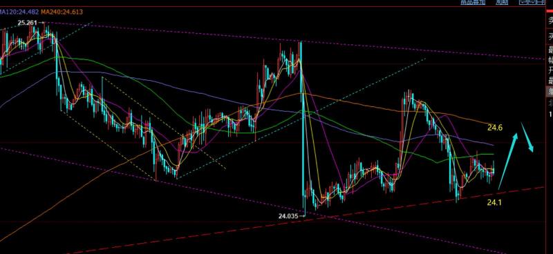 白银方面:日线运行格局和黄金一样,两阳+大阴的模式循环震荡;中轨支撑上移24.1,以及66日均线支撑23.85上,都是短期比较重要的节点位置,高点也逐步下移,原本周初想靠近上方通道趋势线阻力25.05下再看压制跌,进行宽幅整理,但昨日也被提前打压了; 今日关注图中24.1上支撑,24.6下阻力,强压25一线,能拉高再去尝试看跌回落,当前处于偏震荡低位,尝试先看涨反弹修正;