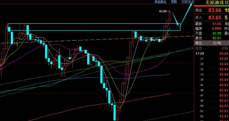 原油方面:昨日亚欧盘出现大幅回测,当失守81.5小双底支撑后,就意味着日线级别要稍微调整下,去出一个78.7-83.3这轮拉升的此低点,而对应位置则是上涨通道的下轨位置80一线;刚好昨晚触及79.9就直接大V持续走高,完美把握这波段,当前突破站上83-83.3,则维持单边强势,作为顶底位置,今晚继续保持拉升,阻力84.4和85.4,若继续往上走,就基本打破周线宽幅区间的上轨,从而中期拉升格局启动,指向92关口概率则加大;