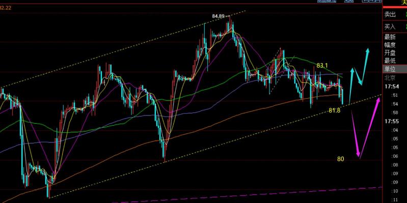 原油方面:短线多次上攻承压83-83.1阻力,当前冲高回落要试探小时线上行通道的下轨关键位置81.8, 看此处得失情况;若守住,就是日内低点,或短期低点;若守不住,则会向下调整至日线中轨80.1一线再企稳拉升; 从短趋势运行通道看,只要坚守80.1上方,涨势还是保持良好,只是回调大或小的区别;