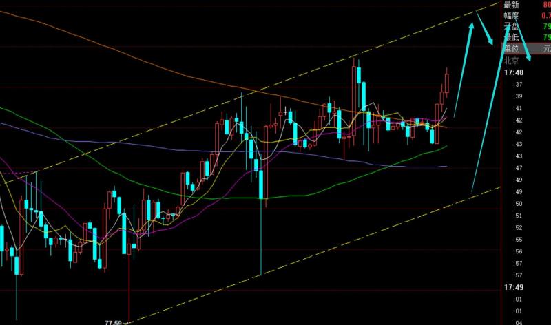 第三,原油方面: 昨日79逢低位置并未触及,看涨方向正确,拉升至80.85高度;