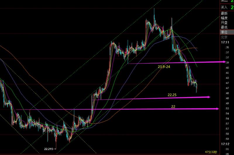 白银方面:从日线级别看,5月份开始,白银基本围绕22-25这3块钱在做来回宽幅整理,一口气涨的快,同样跌的也快; 昨日试探日线中轨并未很好支撑,今日有些刺破,且关注收盘形态;图中,小时线级别,指出几处关键支撑和阻力,23.9-24和23.2-23,都是对应顶底转换处,预计围绕区间得震荡一些时间;同样的,向上突破站上,才能回归强势格局,向下破位失守,短期走弱再次试探底部22.2上方寻求企稳,但中期看涨来讲22-22.2前宽幅启动低点逐步慢上移中,若再拉低下去,衍生支撑点应该在22.6及上,若能给到,也是再一次埋伏波段好位置;