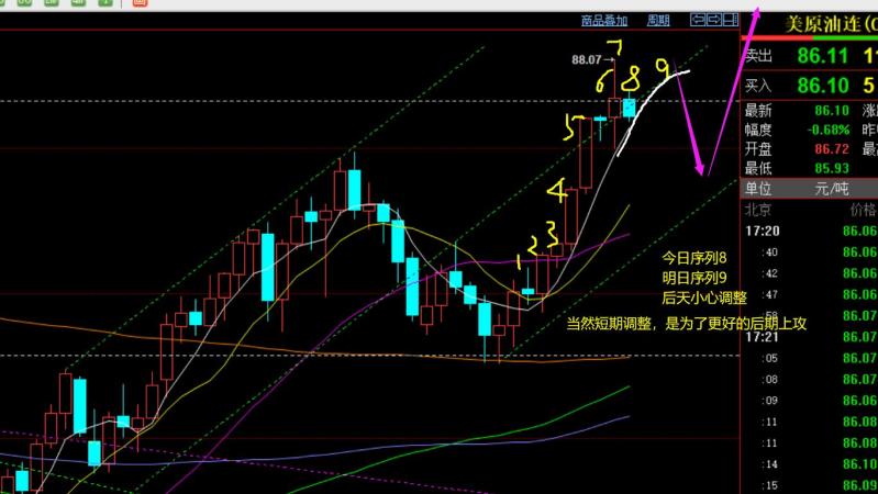 原油方面:昨日晚间受减产消息刺激,一口气从85干到88,作为近期单边强势拉升下,属于同方向消息,看涨也就相对舒服了,昨日研报刚指出一旦突破86.3-86.5,去87、88等都不去猜顶,结果马上就到位了; 从日线中,今日靠近5均线85.7上仍会支撑上攻,这是单边强势的特性;再结合九转序列,短期变盘调整的时间节点可能是本周五,当然下跌调整一波,也是为了后期进一步的稳定强攻破高;日内85.7上支撑,阻力87.6-88下;