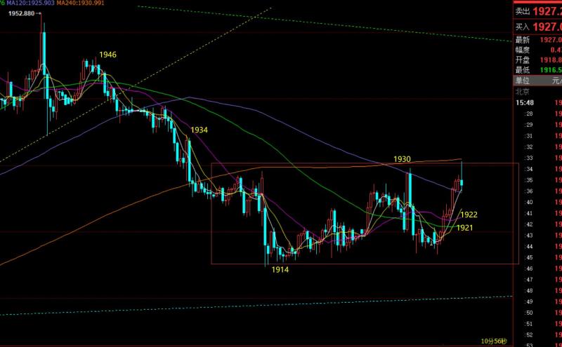 第三,黄金小时线级别:早间先试探隔夜低点而反弹,这很正常,因为笔者经常讲的一句话:作为震荡行情中,一早的延续性是相对较差的,容易续涨或续跌失败;随后一路连阳再次抵达了1930一线阻力点,这几天一直处于1914-1930区间运行;未强攻站上1930前,还需等回测企稳再去看涨,那么1922一线作为中轨处,就首要关注,其次是66日1921,以1914作为防御,反复看探底拉升,直到某一刻强势发力,走出短期底部整理而带来见底的信号;一旦站上1930关口后,往上的压力就是两处关键,1934-37和1946-48;