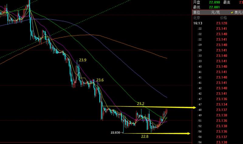 白银方面:它的底部运行区间是22.8-23.2之间,一旦站上23.2拉升上行,则才会企稳结束慢跌,继而转向上涨; 另外,日线形态上,它比金价具备领先信号,一旦出不错的大阳或较长下影,则它出现见底形态,黄金下一日也就容易出底部;强支撑仍继续留意22.6-22.65上;