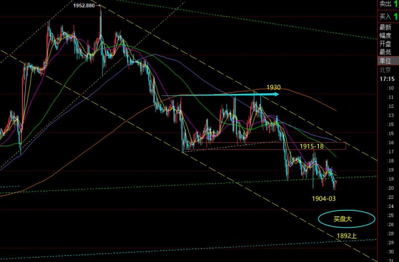 第一,黄金日线级别:昨日继续收阴,不过实体部分不大,低点仍徘徊于前日位置,阻力仍是中轨承压;其实这样的形态是相对好的,因为它在整理磨,只要磨的时间长,则会逐步抗跌,后续就容易起来上攻;若是出现9月5日和6日那样连阴力度偏大的走法,就不利于企稳,会显得很弱;它虽处于震荡慢跌,但只要每天下破低点力度不大,都还可以,继续关注1903支撑以及1897;