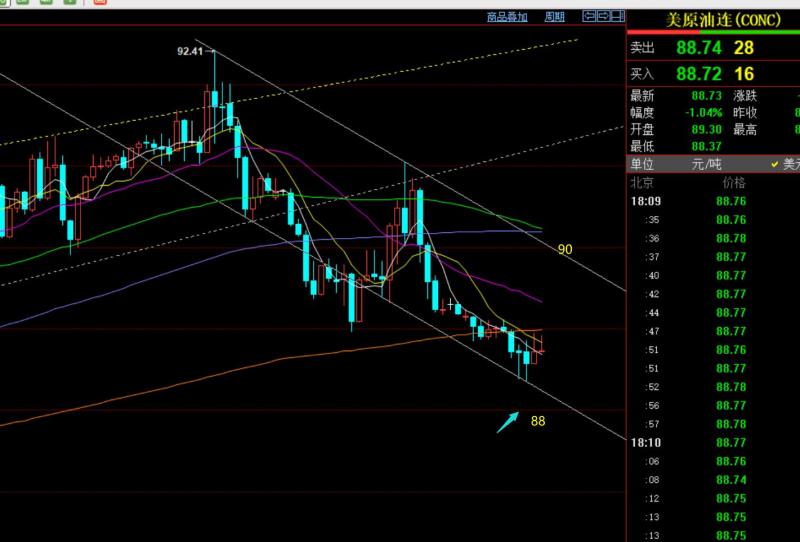 原油方面:日线级别,昨日最终收阴回测,收盘于10均线一线,今日续跌一波,当前有所下穿10日,得看日内收盘来确认;若晚间原油不能拉升回归10均线上方,那么小调整会演变日线级别的大调整; 反之,晚间拉升回去,突破今日89.4高点风水岭了,日线收一个长下影反阳形态,那么10均线当做刺破,仍支撑有效,后面几天仍存在刷新近期高点的概率,然后触及再反复打压调整; 从图中可以看出,关键阻力90,关键支撑88,同样也是看区间性的选择;