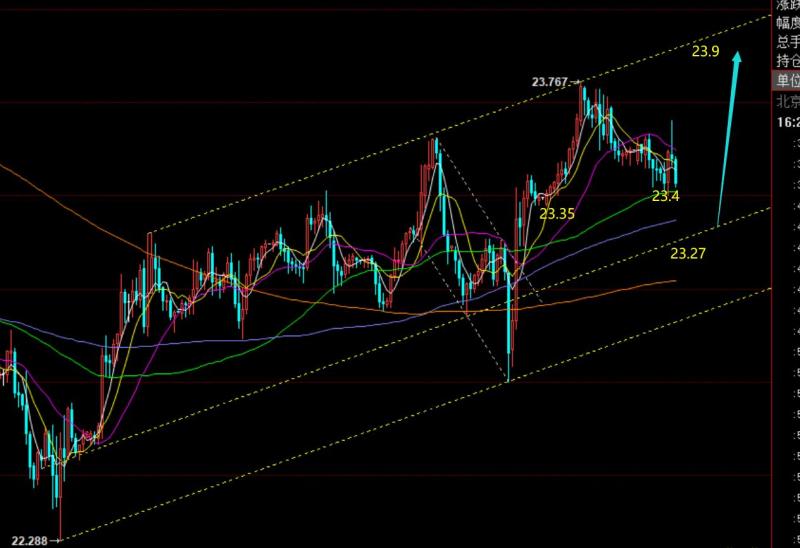 白银方面: 从日线级别上,白银这几天走势略强于黄金,上周五中轨突破后并未最终并未有效站上,今日下探后继续等待企稳拉升; 短期小时线级别图,围绕通道内上下轨之间震荡运行,下轨23.27上支撑,上轨23.9下压制, 当前66日均线23.4支撑,以23.4-23.27作为支撑点,继续尝试逢低看涨为主;
