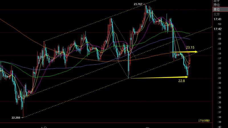 第二,白银方面:同样,晚间受砸盘影响,价格直接大阴急跌失守23.4-23.2支撑,跌至23低位;