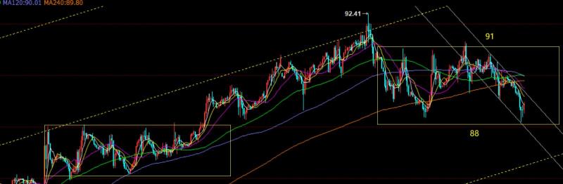 原油方面:这几日原油也处于区间性反复整理,上轨91一线,下轨88一线,目的也就是争夺日线10均线得失情况;从目前来看, 高点和低点都在缓慢下移,一旦今夜无法再反补拉升回到10均线89.9一线,也就是今天早上高点,那么从92.4压制下来的这一波小调整或演变为大调整,去试探周线10均线85关口,最终会稳定继续演绎单边多头拉升;现在短线阻力89.3,支撑88,也同样观察上下的得失信号再出手;