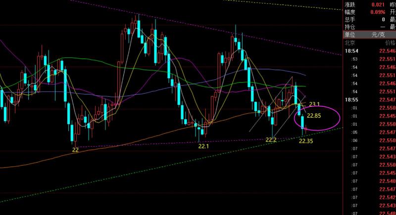 白银方面:同样如此,等待日线级别连阴之后出一个底部箱体震荡区间,目前支撑留意22.35上,前期22.2-22也有关键支撑,阻力22.85和23.15,区间先运行对待;