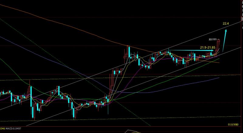 白银方面:日线级别,也逐步反弹上攻,短期均线金叉支撑于21.6上,今日上方阻力目标留意中轨22.4,和通道反压22.5两处; 从图中短周期通道来看,21.9-21.85成为顶底支撑,逢低仍继续看涨,上轨指向22.4一线;