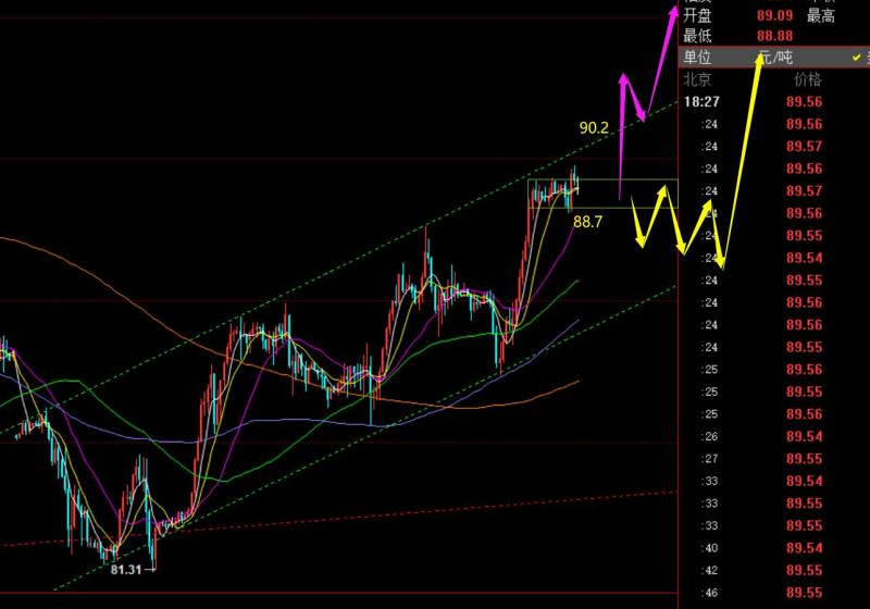 原油方面:本周应该收阳,且站上5均线88关口,那么下周依托88极大可能进一步的走高拉升;日线级别,昨日大幅反攻,结束本周初的区间扫荡,以大阳形态继续推动拉升,逐步展开新一轮的单边趋势上行;目前有所回归前期上涨通道之内,先留意88.5-88.7通道回踩点,日内这里若能强势横盘抗跌不下的话,就有概率继续收报大阳冲;反之,今日若守不住此位置,冲高回落收阴了,那么下周初又可能先展开区间扫荡整理,然后再酝酿下一波的大幅反攻拉升;针对日内走势,隔夜大幅走高,今日高位横盘不下,欧盘也并未直接连阳上冲,则今晚留意时间节点,一旦22点前,始终无法下行调整,就有概率夜间继续猛冲上拉,小时线中轨88.7比较重要,短期阻力90.2也重要,是一个通道的上轨;先以88.7支撑上继续强势看涨来对待,突破站上90.2阻力后,则会大幅发力拉升,下周就可以冲95前高;反之,若守不住88.7,就还是小时线级别通道之内扫盘整理,酝酿两日后再去启动破位拉升;